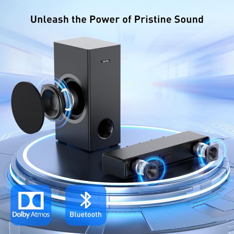 Sonic Blast Sound Bar with subwoofer for Smart TV Dolby Atmos 2.1CH Wireless Bluetooth 3D Surround Sound Soundbar Deep Bass Adjustable Home Theater Surround System TV Speaker Works with 4K & HD TV