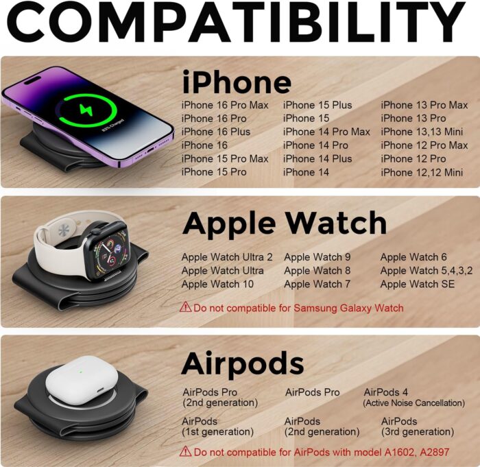 Fast Wireless Charging Station: This wireless charging station is specifically designed to be compatible for iPhone Airpods Apple Watch; With an 18 W quick charger, you can fully charge your device in just 2-3 hours. 3 in one charger for Apple Watch/iWatch/Airpods/iPhone 16 15 14,13,13Pro,13Pro Max,12,12 Pro,12Pro Max,12 Mini