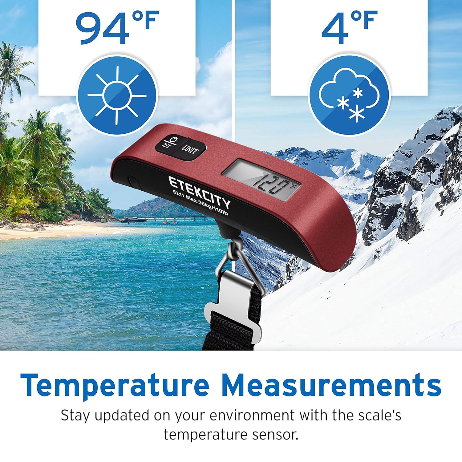Etekcity Luggage Scale, Digital Weight Scales for Travel Accessories Essentials Suitcases , Portable Handheld Scale with Temperature Sensor, Rubber Paint, 110 Pounds, Battery Included