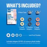 Each 2 Bottle Kit comes with 2 Base Caps (38mm) and 6 Adapters – 2 large (33mm), 2 medium (28mm), and 2 small (24mm) – flip up to 2 bottles at once!