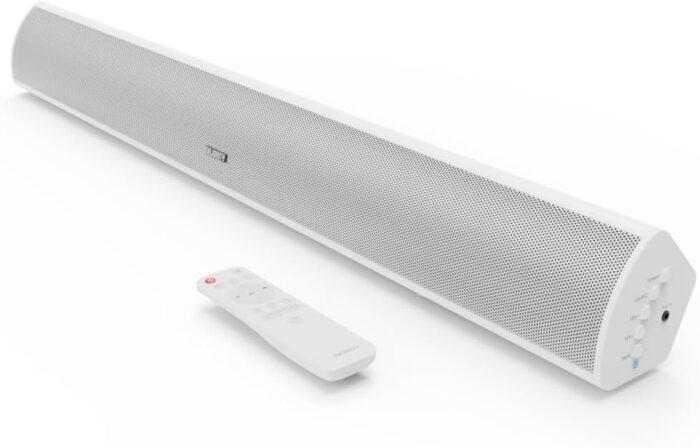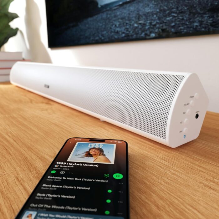 𝗛𝗜𝗚𝗛 𝗗𝗘𝗙𝗜𝗡𝗜𝗧𝗜𝗢𝗡 𝗔𝗨𝗗𝗜𝗢: The Teton soundbar is a slim audio sound bar with a built in subwoofer that fits perfectly under your TV or on a desk. Use the buttons on the side of the soundbar or the supplied remote to go truly wireless and adjust the volume, equaliser settings, source and much more. An ideal sound bar for TV or PC, fill your room and immerse yourself with high definition sound in your very own home.