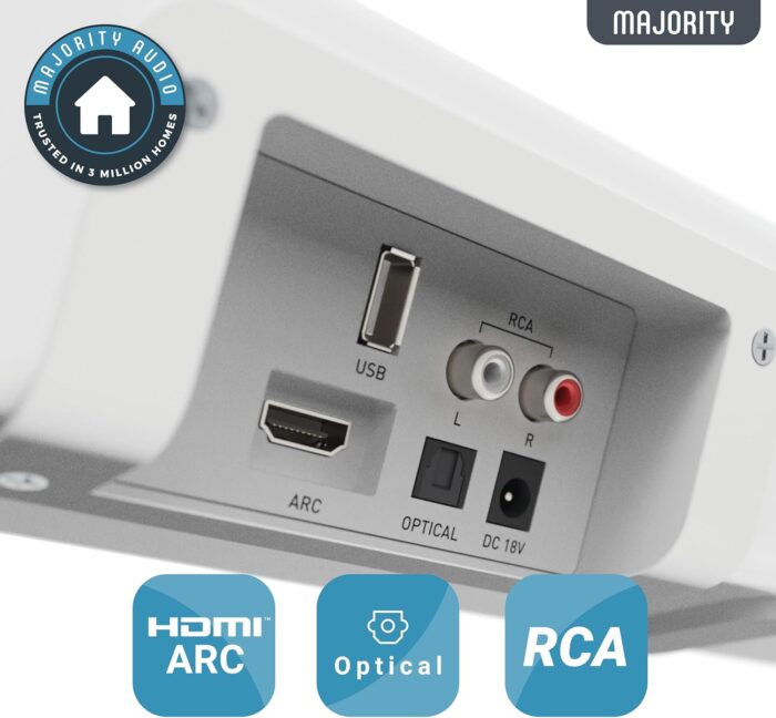𝗣𝗔𝗖𝗞𝗘𝗗 𝗙𝗨𝗟𝗟 𝗢𝗙 𝗙𝗘𝗔𝗧𝗨𝗥𝗘𝗦: Our Majority soundbar has been designed with ease of use in mind – simply plug in and play using the wide range of connections. Connect to your TV in lightning speed by using the HDMI ARC or optical input for high clarity and rich audio. Listen to your playlists straight from your phone through the latest Bluetooth technology, plug in your MP3 player to the AUX or USB input.
