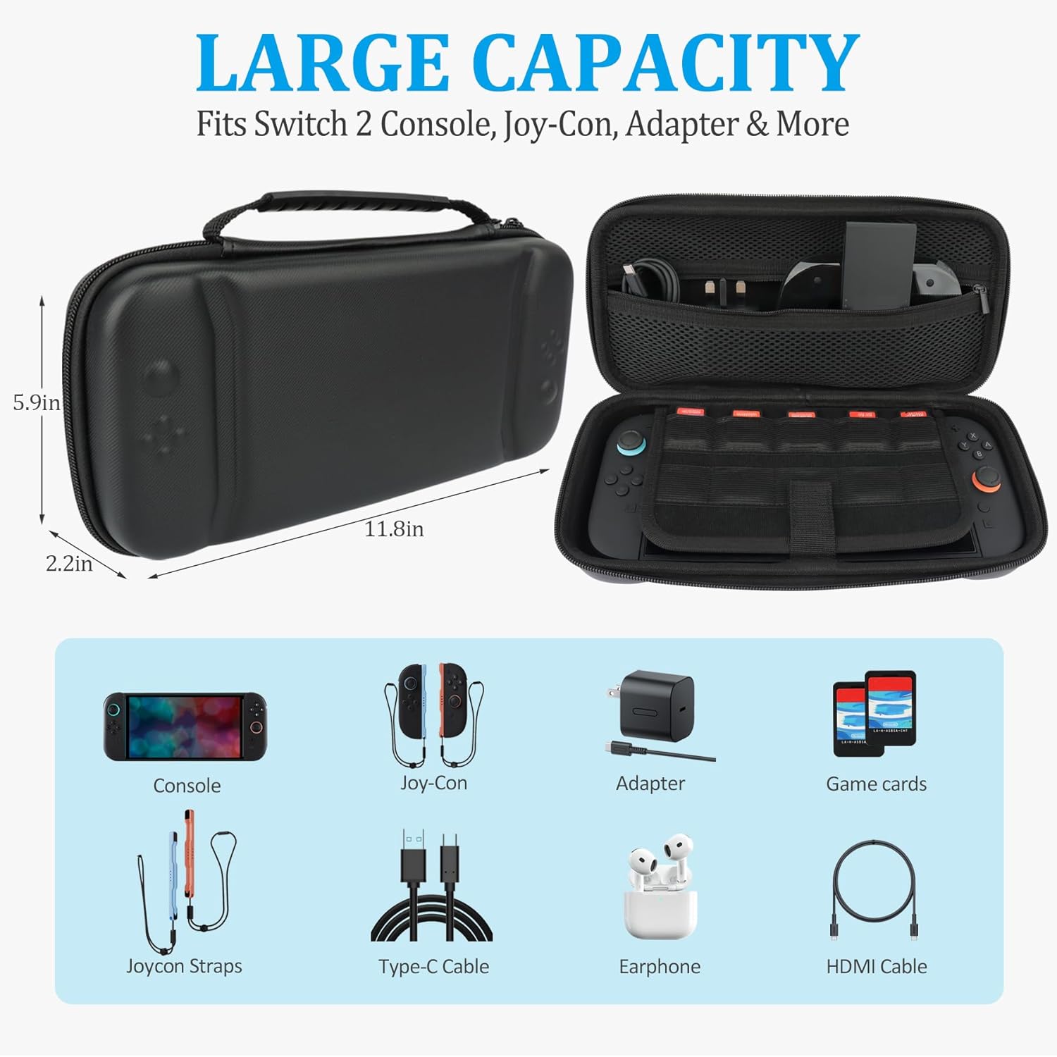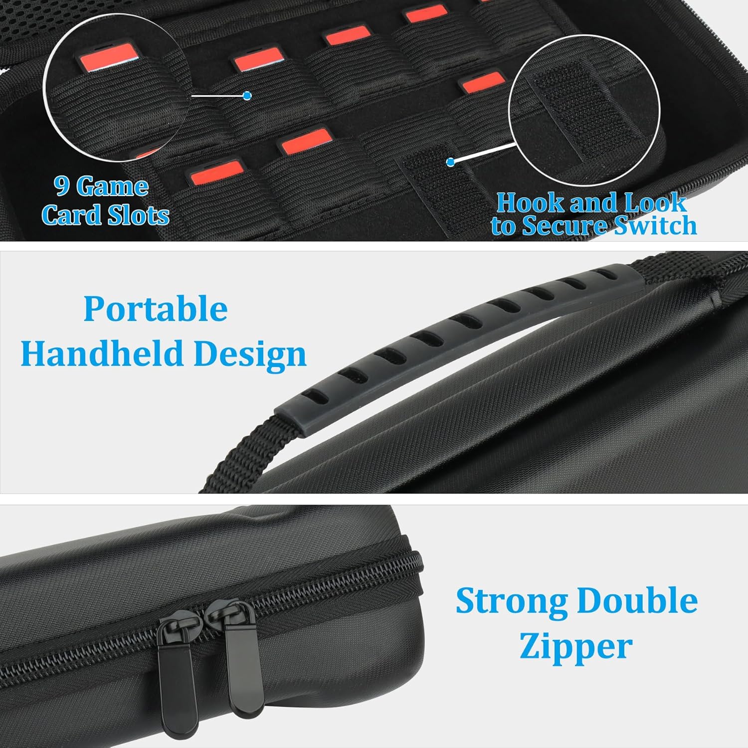 Switch 2 Carrying Case: Constructed from water-resistant leather, and with a shock-resistant EVA shell, and soft anti-scratch plush lining, it offers robust protection. Carrying case is tailored for Nintendo Switch 2 console, ensuring your console and accessories are secured. The handle is comfortable to carried in hand. Secure dual zippers and hook-and-loop closure enable easy access with reliable protection.