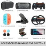 All-in-One Accessories Kit for Nintendo Switch 2: 1x Carrying Case, 1x Dockable Protective Case, 2x Joy-Con Grips, 2x Steering Wheels, 2x Tempered Glass Screen Protectors, 1x Playstand, 1x Game Card Case, 2x Joy-Con Silicone Covers, 4x Thumb Caps.