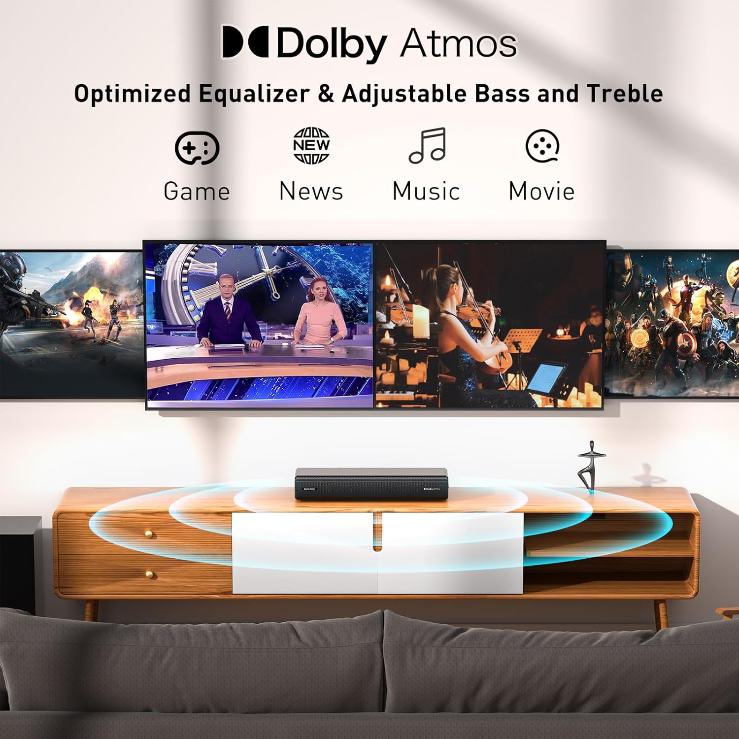 4 Equalizer Modes: The surround sound system for TV features 4 preset sound effect modes: movies, music, game and news, which save you the trouble of messing around with treble and bass and allow you to immerse into the movies or music by just clicking the button on remote.